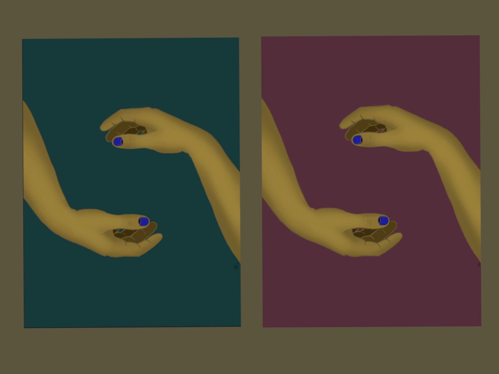 High quality 8x10 Matte print of digital artwork Yellow Hands/Forearms with Deep Purple or Deep Teal Background
